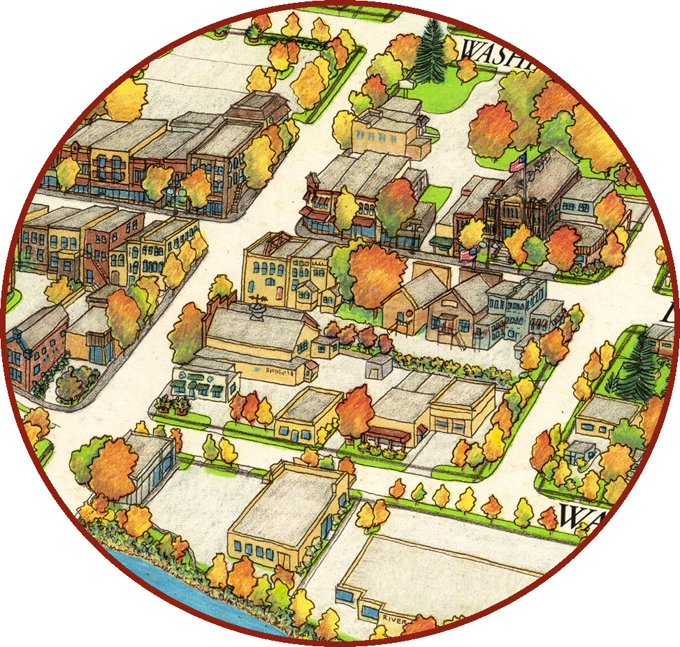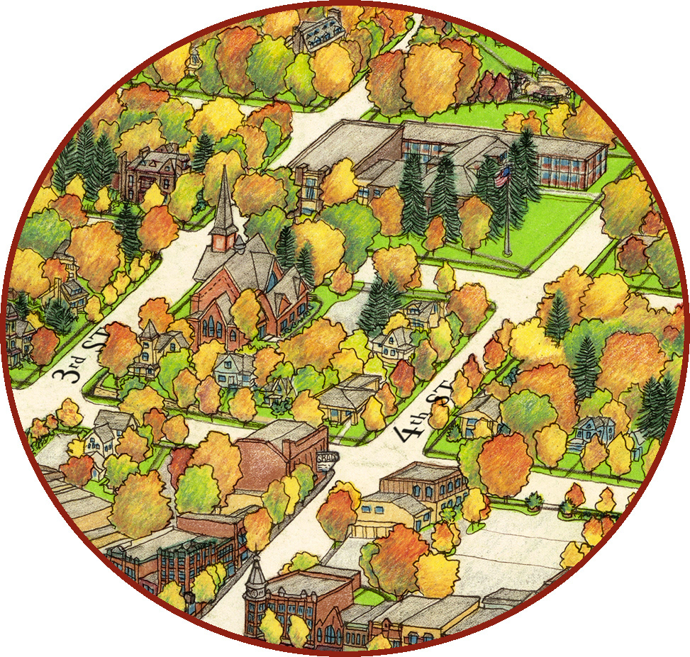 East of Downtown Northfield showing Washington Street and 3rd to 4th Street including the Grand Theatre, United Church of Christ, Carleton Presidents House, old Middle School - now Carleton College Weitz Center for Arts - from the Bird's Eye View 'Map' of Northfield by Jim Bohnhoff.